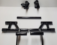 Cage has 4 contact points that protects bike , with 6 mounting points(4 that mounts to each side of frame and 2 that mounts to the extra thick steel rearsets). Rearsets comes with CNC Folding Aluminum Pegs or Solid Pegs, has crossbar (which really not needed with them being 3/8" steel) . Comes with all hardware to mount.