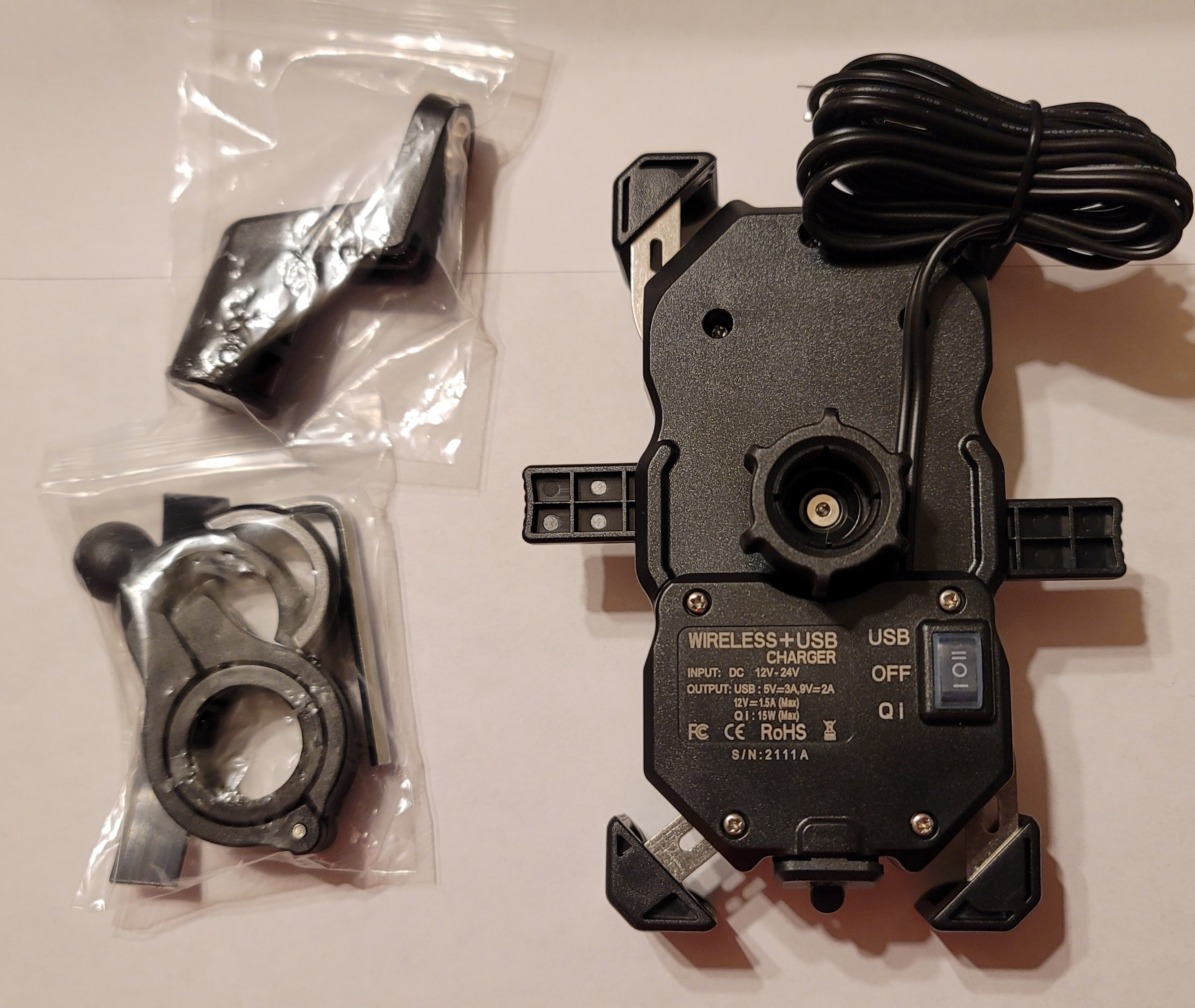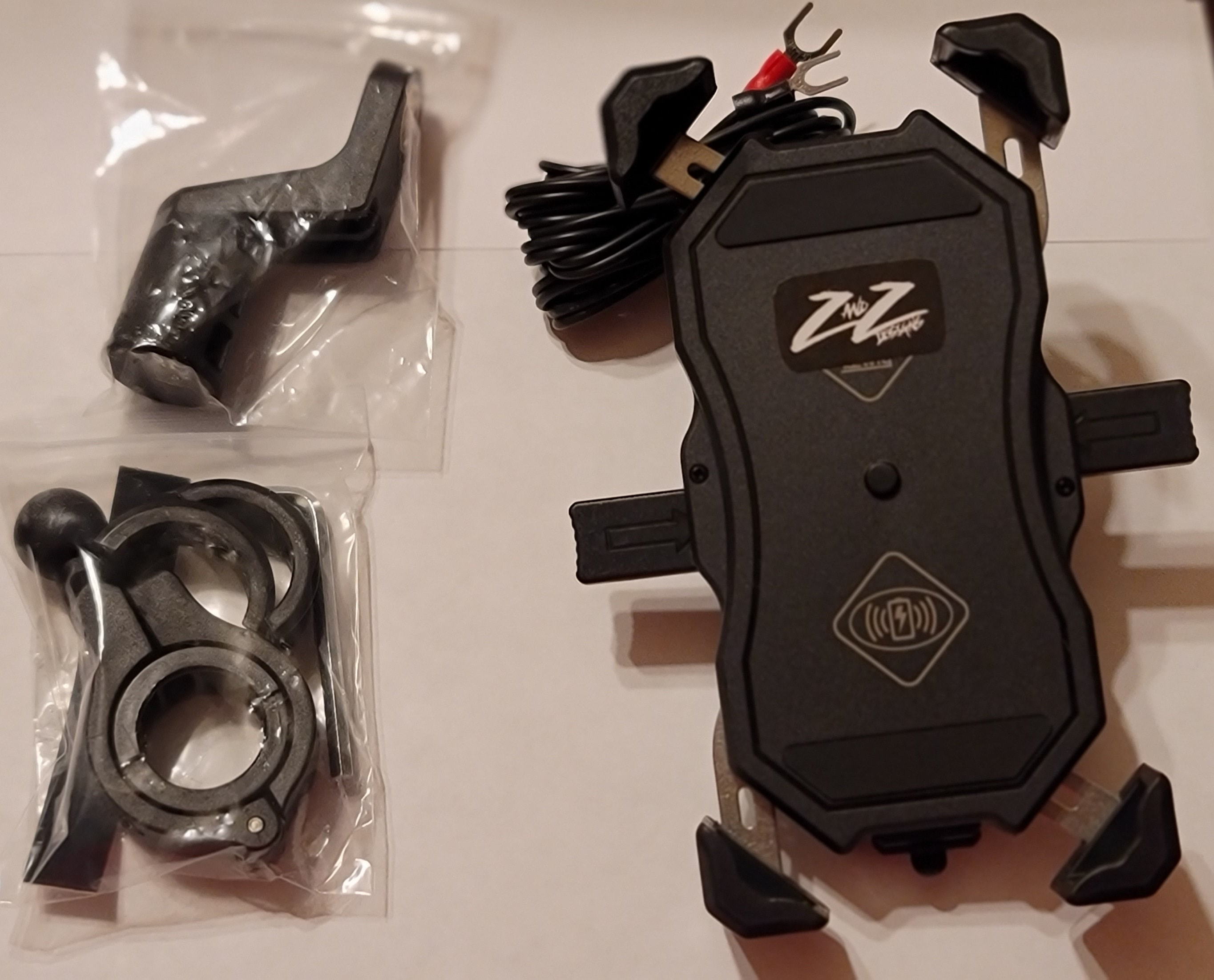This is the ultimate Phone Holder that'll hold smallest Phone up to Note 20 ultra with case on it! Charges either using wireless or USB. Has 5 foot long wires to connect to any wiring connect you choose. Has multiple attachments to allow to install on handle bars (7/8" - 1⅛" or larger) , and can be installed using mirror mount. Comes with tool to install, zip ties to neatly hide wiring , extra fuse , and rubber non-slip grip . Truly perfect setup for anyone that's looking for a Phone mount for their Motorcycle.